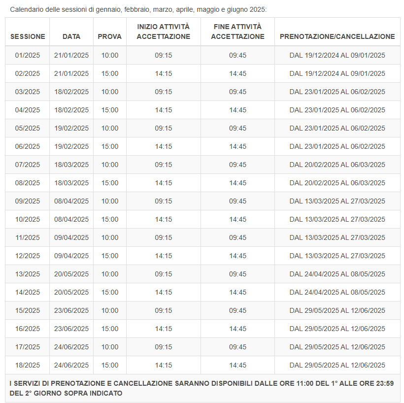 Le sessioni si svolgeranno nei giorni 20 e 21 gennaio luglio, 17 febbraio, 17 e 18 marzo, 21 aprile, 19 e 20 maggio, 23 giugno con inizio alle ore 10:00 e 15:00 di ciascun giorno e sarà possibile prenotarsi, fino ad esaurimento dei posti disponibili, fino ad una decina di giorni prima della data d’esame, come da Bando pubblicato.