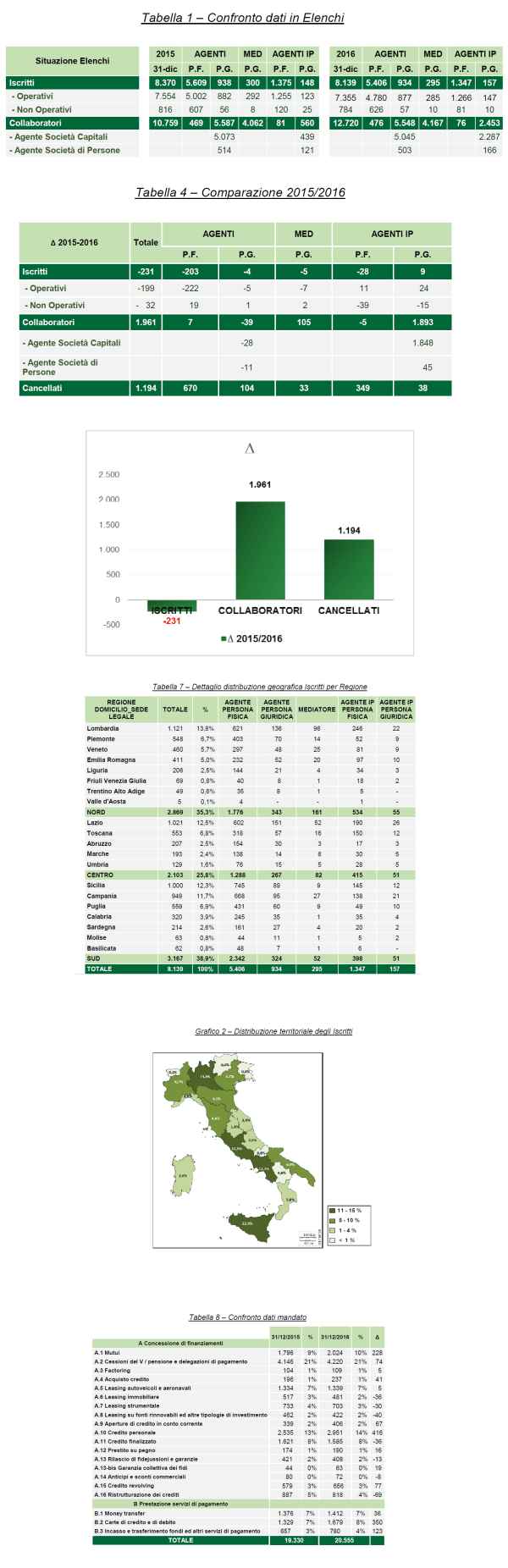 Dai dati della relazione annuale dell’Oam emerge che nel 2016 gli iscritti sono diminuiti, rispetto all’anno precedente, di poco meno del 2,8% (-231 unità), mentre i mandati comunicati risultano complessivamente 20.555, con un aumento di 1.225 unità (il 58% relativo alla concessione di finanziamenti, il restante ai servizi di pagamento).