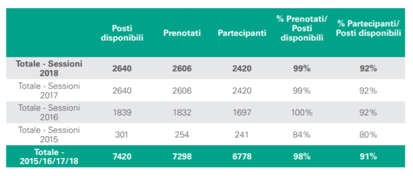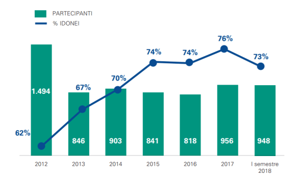 I dati (aggiornati a dicembre 2018) mostrano come negli ultimi tre anni il numero di partecipanti sia stato in media 907 con un tasso di idonei di circa il 74%.