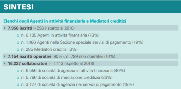 Del resto, l’andamento dei mandati conferma la vitalità del settore: a fine 2019 i mandati risultano complessivamente 25.873 ed emerge un importante aumento di 3.241 unità (+14%), triplicando quanto già registrato a fine 2018 (+5%). Il 2019 ha mantenuto sostanzialmente i dati del 2018, con la “Cessione del V dello stipendio/pensione e delegazioni di pagamento” come prodotto maggiormente presente sul mercato (18%), seguito dal “Credito personale” (14%) e dai “Mutui” (10%).