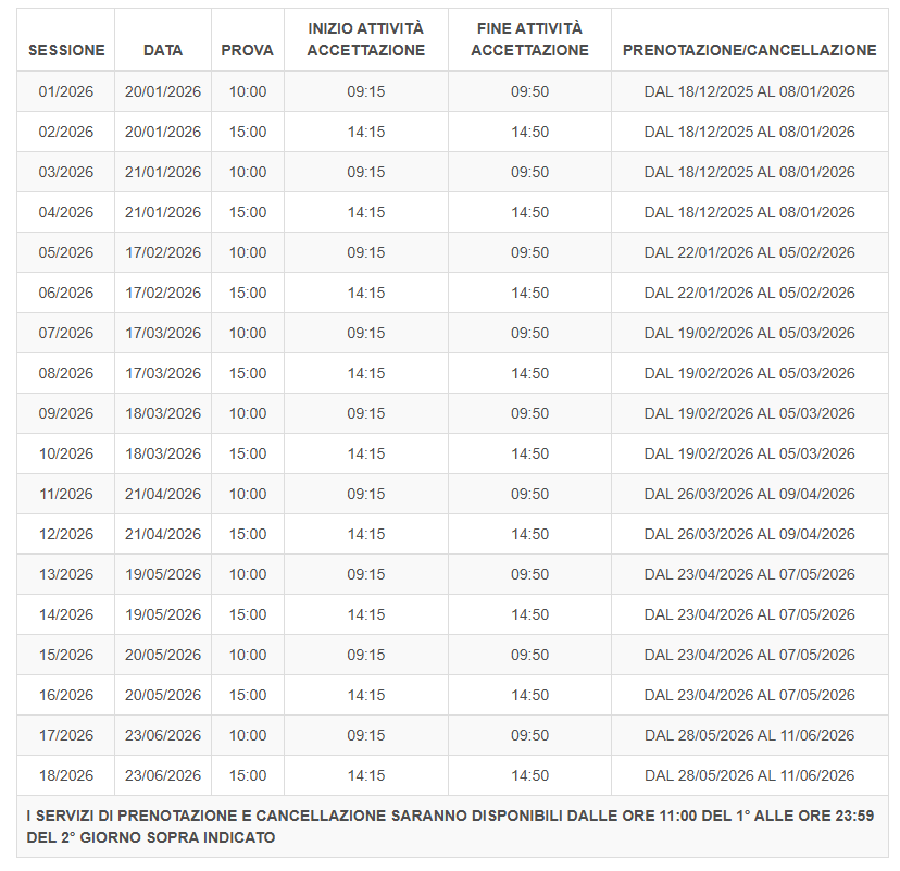 Le sessioni si svolgeranno nei giorni 20 e 21 gennaio luglio, 17 febbraio, 17 e 18 marzo, 21 aprile, 19 e 20 maggio, 23 giugno con inizio alle ore 10:00 e 15:00 di ciascun giorno e sarà possibile prenotarsi, fino ad esaurimento dei posti disponibili, fino ad una decina di giorni prima della data d’esame, come da Bando pubblicato.